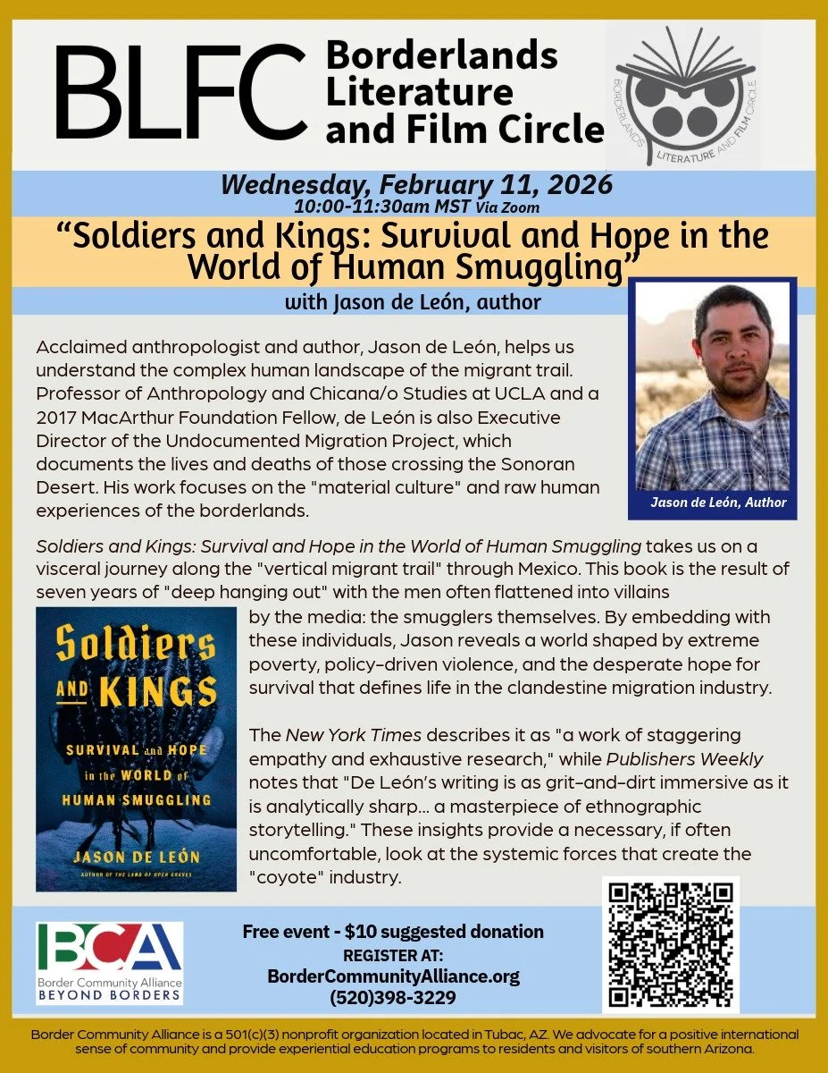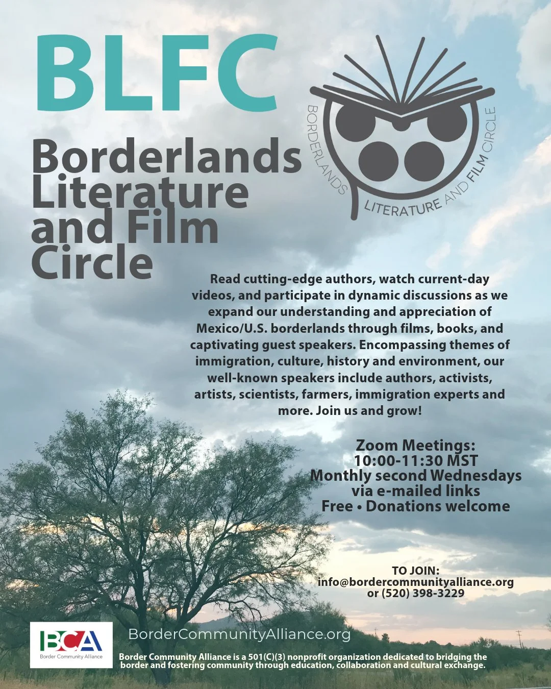The Borderlands Literature and Film Circle (BLFC) is a monthly event on Zoom. Read cutting-edge authors, watch films, and participate in dynamic discussions as we expand our understanding of the Mexico-U.S. borderlands through films, books, and captivating guest speakers.