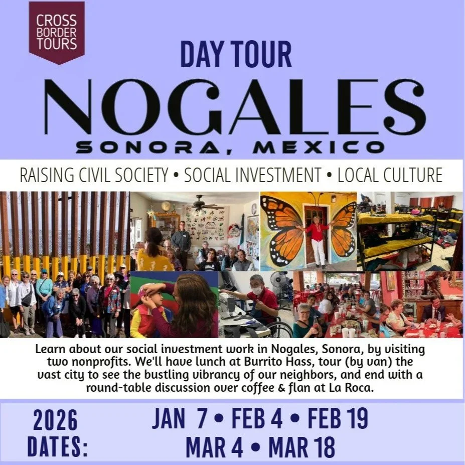 On this tour we will visit two of our partner nonprofit organizations in Nogales, Sonora and learn about the value of “social investment” in cultivating community with our neighbors. For lunch we will enjoy the best burrito ever, featuring Sonoran tortillas at Burrito Hass. Then learn about the vast city of Nogales, Sonora as we tour the various neighborhoods. We will end the day with coffee and flan at La Roca.