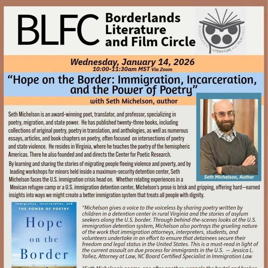 Join us on Zoom for our monthly BLFC. Seth Michelson is an award-winning poet, translator, and professor. He has published twenty-three books, including collections of original poetry, poetry in translation, and anthologies, as well as numerous essays, articles, and book chapters on poetry, often focused on intersections of poetry and state violence. We will discuss his book, “Hope on the Border: Immigration, Incarceration, and the Power of Poetry.”